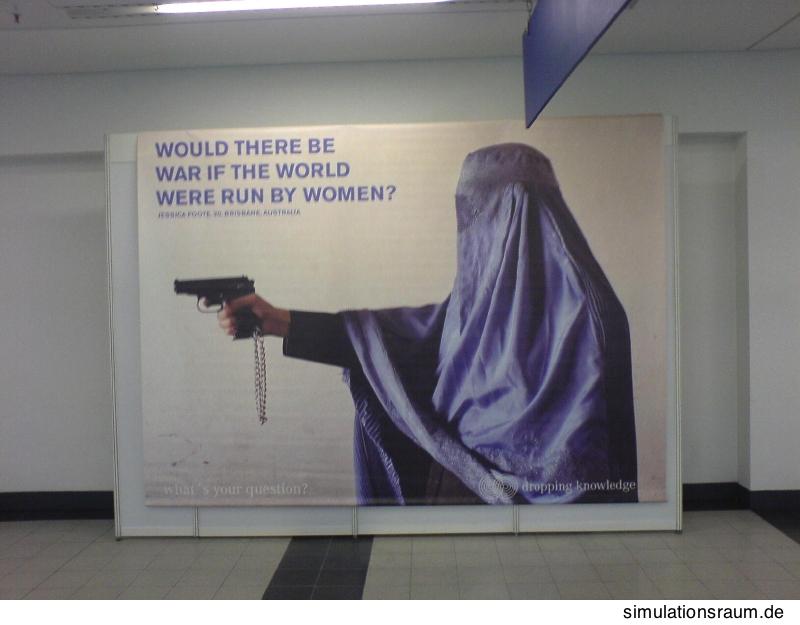 In der Halle 6 auf der 3. Etage befand sich das Pressezentrum, bewacht von einer vermummten Frau:
