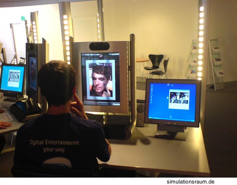 Interessant dort – vor allem auch im Hinblick auf mediale Raumübergrife – war ein Stand, auf dem ein 3D-Projektionsgerät vorgestellt wurde, das ohne Brille funktioniert. Eine Reihe Kameras oberhalb des Monitors sind dafür zuständig, die Augen des Nutzers zu tracken und ein speziell auf ihn abgestimmtes stereoskopisches Bild auf dem Monitor zu erzeugen. Auf der Unterseite des Monitors befinden sich ebenfalls Kameras, die die Handbewegungen registrieren. Man kann also in das "Hologramm" hineingreifen, und es dadurch bewegen, steuern und manipulieren. Derzeit ist das System noch für Kiosk-Anwendungen (in Schalterhallen etc.) eingerichtet. Weil es nur jeweils auf einen Betrachter abstimmbar ist, kann es wohl kaum individuelle Sehergrenzen überschreiten. Interessant wäre jedoch eine Anwendung für Computermonitore im Heimbereich.