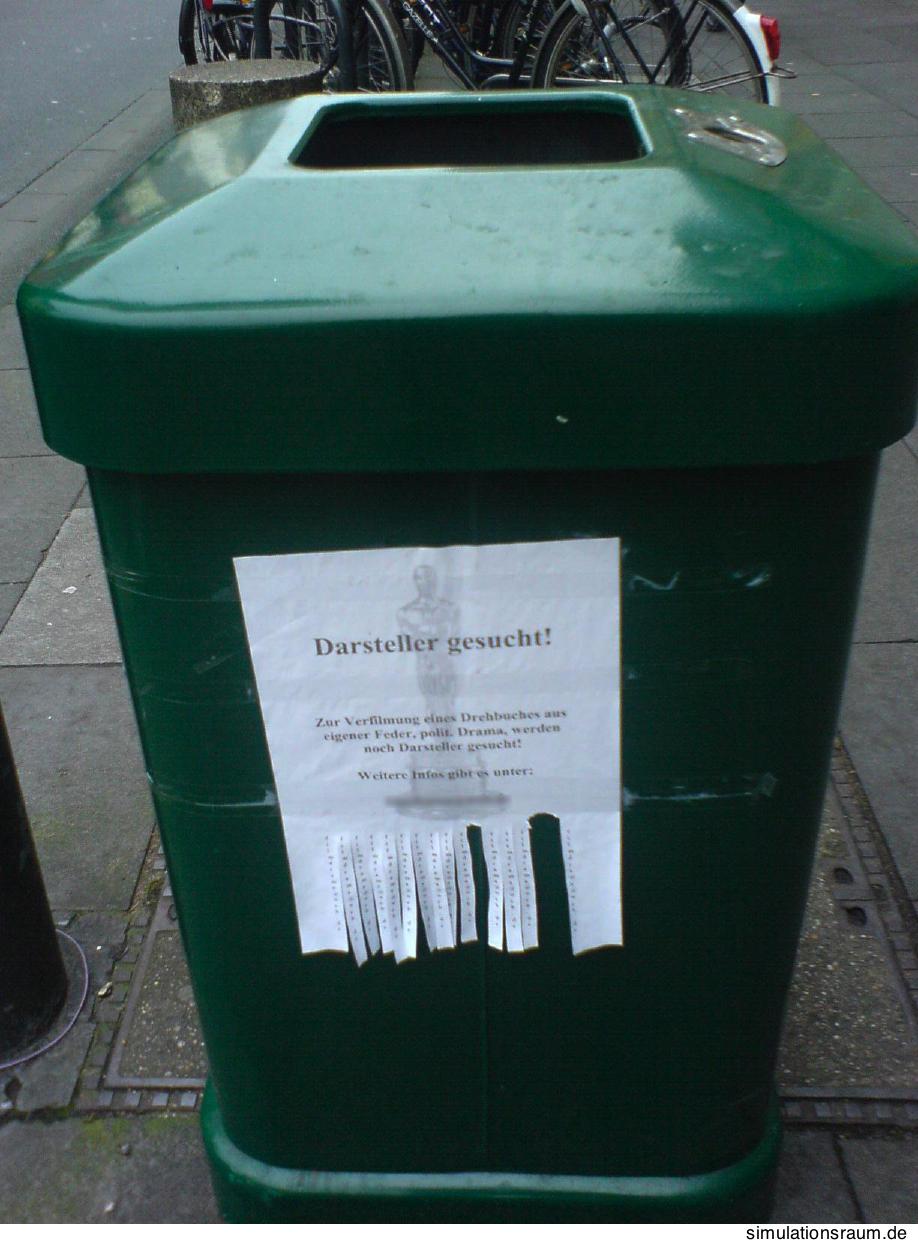 Du hättest wenigsten dafür sorgen können, dass man die Telefonnummer erkennt. Vielleicht hätte sich dann endlich mal jemand für mein oscarreifes Polit-Drama (Arbeitstitel OSCAR L. AUS DER TONNE) gemeldet.