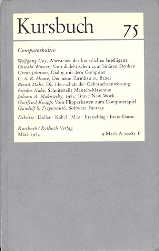 Kursbuch Nr. 75, darin zehn Essays über Computerspiele, Künstliche Intelligenz, Mensch-Maschine-Schnittstellen und vieles andere, um was man sich als Geisteswissenschaftler im Jahr 1984 Sorgen und Hoffnungen gemacht hat. Spannend: ein Essay von Oswald Wiener über Dialektik und Kybernetik und einer von Gottfried Knapp über die Kindertage des Computerspiels.