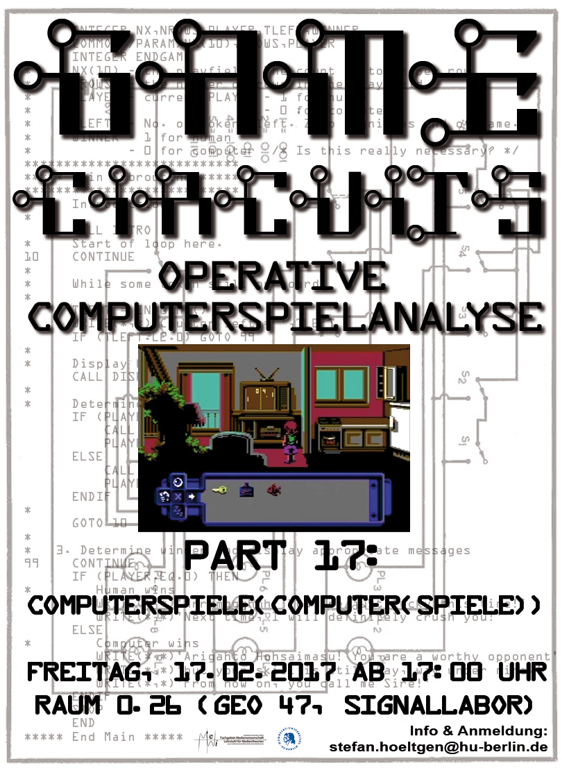 Folge 17 der Reihe „Game Circuits“ widmet sich der Darstellung von Computern und Computerspielen innerhalb von Computerspielen. In einem einleitenden Vortrag wird die Geschichte und Phänomenologie dieses Motivs an konkreten Beispielen vorgestellt und seine kultur- und literaturwissenschaftliche
